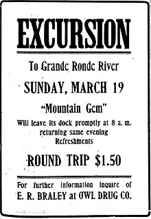 In mid-October 1904, Captain William P. Gray took Mountain Gem upriver from Lewiston.[10] Originally it had been intended to take the steamer as far as the Wild Goose Rapids, but river conditions prevented the boat from going farther than Grand Ronde.[10] Recent heavy storms had caused landslides into the river, creating additional rapids.[10]