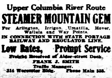 In early April 1906, Frank J. Smith, transportation manager for Mountain Gem, reported that the steamer's route had been extended to Kennewick and Pasco, Washington, both on the Columbia River, upstream from Wallula.[13] These two towns had never before had steamboat service.[13] Mountain Gem would also connect with the White Bluffs Transportation Company which ran to Priest Rapids on the upper Columbia.[13] In October 1906, Mountain Gem was the largest steamboat on the upper Columbia, and carried wheat from Hover, Washington, to Celilo, a distance of 115 miles.[14]