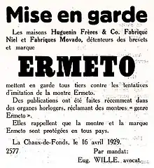Houses Hugenin Frères & Co. Fabrique Niel and Fabriques Movado, holders of the patents and brand ERMETO warn all third parties against attempts to imitate the Ermeto watch. Publications have recently been made in watchmaking bodies, claiming <<Ermeto type>> watches. They are reminded that the watch and the brand Ermeto are protected in all countries. La Chaux-de-Fonds, 16 April 1929. Translated from the French.