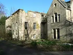 Moy House was designated a Category A listed building in 1971.[1] In 1988, concerns were reported in the local press about the condition of the building, which was at that date occupied in part by its owners, with some of the house rented to tenants. In 1990 it was listed on the Buildings at Risk Register for Scotland, and the local authority issued a repair notice, but the owners asserted that they were unable to afford cost of repairs, which were estimated at £80,000 - £160,000. A plan was put forward to build new properties within the house's grounds, which would raise funds to allow the repair of the house, but these were refused. In 1991, compulsory purchase proceedings were initiated, but these were appealed, and eventually rescinded, in 1992. A new plan for twelve houses to be built on the grounds was submitted later that year, which was accepted, and the building was completed in 1994, and in 1995 a fire broke out in Moy House that reduced it to a ruinous state. External supports were erected to stabilise the fabric of the building, and it was boarded up. Its owners indicated in 1997 that they hope to restore the house and convert it into flats, but building has remained abandoned and boarded up since the fire. The Buildings at Risk Register for Scotland rates its condition as ruinous, and its level of risk as severe.[3]