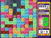 Mr. Driller 2 is a puzzle video game, and the direct sequel to Mr. Driller. The playing area consists of a large stack of colored blocks, as the Drillers (Susumu or Anna) the player must dig through these blocks to reach the end goal located at a certain depth, except in Endless Driller where there is an infinite number of blocks. The player is given a limited number of lives and a limited supply of air to reach the goal. Throughout the playing area, the player can find air capsules to replenish 20% of their air supply. If the driller is either crushed by blocks or runs out of air, the player will lose a life.