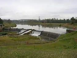 ![]() The weir creating the Camps Drift section of the Msunduzi, in Pietermaritzburg. This dammed section is used for canoe and rowing practice, and is the starting point of the Dusi Canoe Marathon. | |