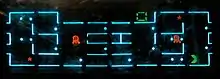 The Munchman game runs on six volts DC and can be powered by four 'C' type batteries or alternatively via a low voltage mains adaptor.[4] As the display is based on VFD technology, it allows bright, multicoloured in-game elements to be rendered but at the cost of a relatively small screen size. The VFD display is manufactured with the pre-formed, immutable in-game objects effectively fixed in place onto a dark background. Each element can be individually lit or unlit during play, giving the illusion of animation and movement. In-game objects cannot touch or superimpose one another, which is not ideal for a Pac-Man clone, as in the arcade version, the Pac-Man and ghosts do collide.