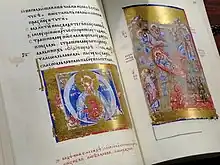 The Munich Serbian Psalter is a manuscript book written in Church Slavonic of the Serbian recension, in uncial Cyrillic script.[2] It is a representative of the revised version of the Church Slavonic psalter text which came into use in the early 14th century. Compared with previous psalter texts, this version is a closer translation of the Greek original into Church Slavonic.[3][4] Beside the Psalms, the manuscript also contains the canticles and the Akathist to the Theotokos.[5] It is illustrated with 148 miniatures, which often occupy whole pages,[1] and is regarded as the most extensively illuminated Serbian manuscript book.[6] It has 229 paper leaves in the quarto format, now measuring 28 by 19.7 centimetres. The text columns measure 19 by 12 centimetres and the usual height of the letters is 4 to 5 millimetres; the columns written in such letters consist of 21 lines or, exceptionally, 22 lines. The miniatures' captions are written in red in half-uncial script, with letters smaller than those of the normal text.[2] Some of the captions contain traits of the Serbian vernacular.[7] The titles of the psalms are written in gold on a red background, and most of them include a comment indicating how the psalm is related to Christ and the New Testament.[8] The recto of the first leaf (folio 1r) was originally left blank, but now it contains inscriptions which span several centuries.[2]