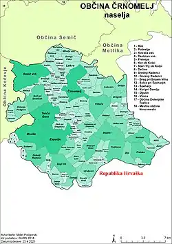 The Municipality of Črnomelj (pronounced [tʃəɾˈnoːməl]; Slovene: Občina Črnomelj) is a municipality in southeastern Slovenia. The seat of the municipality is the town of Črnomelj. The municipality is at the heart of the area of White Carniola, the southeastern part of the traditional region of Lower Carniola. It is now included in the Southeast Slovenia Statistical Region.