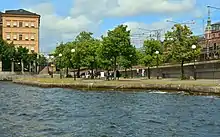 Moored at the quay is the Helikopterplattan (Helicopter Platform). In addition to being the only helicopter platform in central Stockholm, it has been known since the mid-1980s as a favourite hangout for white power skinheads and other far right activists.[2][3][4]