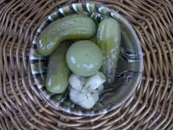 Murături (Romanian for pickles) are vegetables or fruit pickled in brine, with added dill, oak leaves, celery and others for flavoring and preservation, as found in the Romanian cuisine of Romania and Moldova.[1][2][3] The pickles are ordinarily made of locally grown produce such as beetroot, cucumber, green tomatoes (Romanian: gogonele), carrots, cabbage, bell peppers, watermelons, mushrooms, turnips, celery and cauliflower.[4]