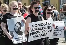 A marcher with Marching for Those Who Can't holding up a sign in memory of Ahmet Yıldız in the 2015 Helsinki Pride