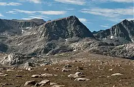 Muriel Peak is a 12,937-foot-elevation (3,943 meter) double summit mountain located in the Sierra Nevada mountain range in Fresno County, California, United States.[6] The true summit is set within the John Muir Wilderness on land managed by Sierra National Forest, whereas the slightly lower south summit is on the boundary shared with Kings Canyon National Park. It is situated one mile northeast of Mount Goethe and one mile south of Muriel Lake. Muriel Peak is the 167th-highest peak in California,[4] and topographic relief is significant as the summit rises 1,600 feet (490 meters) above Muriel Lake.