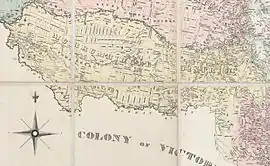 - ↑ Map of New South Wales and Victoria showing squatting districts with number of stations, acres in cultivation, free and bond populations, horses, cattle and sheep. 1843