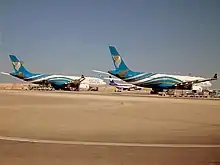 Oman Air Airbus A330-300s parked on the apron of the old terminal. Until the opening of the new terminal, there were no jetbridges available.