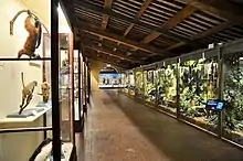 The cetacean gallery is a 110-meter long space surmounted by a gabled roof. When the friars still inhabited the Certosa, it was used for drying hay and grains, which were then stored in the numerous silos located at the edge of the structure. The exhibition was organized in 2018 into eight thematic areas containing more than 28 skeletons from the 27 species present in the collection, as well as 11 life-sized models including a baleen, five casts of fossils mostly discovered and studied by the team of the University of Pisa, such as that of Livyatan melvillei as well as from real fossils, such as the holotypes of Balaenula astensis, found in Portacomaro in 1940.[4]