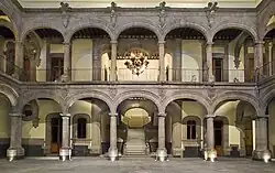 Inside, the house has two floors with two courtyards, which was common with houses of Mexican nobility. The family's coat-of-arms adorn the arches of the main courtyard. One distinctive element of the palace is the fountain in the shape of a shell located in the main courtyard. Its deteriorated condition and the fact that there is little space between it and the windows near it suggest that it dates back to before the 18th-century remodeling. The focus of the fountain is a Nereid playing a guitar. It is possible that the marine motif refers to the sea voyages the Counts made to places like the Philippines.[3]