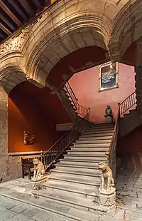 The house had its own chapel, but only fragments of the facade remain in the structure today. One room that survives nearly intact is the music room. In the 19th century, music was one of the activities that the upper-class engaged in on a daily basis. European composers such as Franz Schubert, Chopin, Beethoven and Liszt were preferred but music by Mexican composers such as Tomás León, Aniceto Ortega and Melesio Morales could be played as well. Music rooms were considered important during that time period to show the culture of the family.[3] The main stairwell is located in the main courtyard opposite the nereid fountain. The dogs that adorn the banister of the main stairwell and the mascarons over the main doorway have an Oriental look to them, which was not common in such residences. Partly because of this, it has been speculated that the wood and the labor used to create parts of the house were of Philippine origin. However, both the work and the wood are native to Mexico, although the wood is not very common.[3]