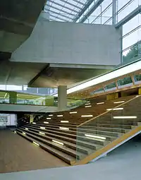 The cement and glass building, located on a slope leading up to the Liseberg amusement park, is graceful, compact and modernistic. Its four-storey glass atrium looks out on mountains and woods.[2]