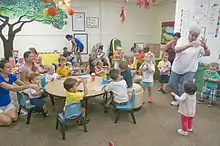 There are many benefits that music provides for children as they continue to grow. The benefits that young children acquire through music include social skills, emotional self-regulating abilities, cognitive benefits, and physical benefits. Socially, children have the opportunity to learn how to take turns and play with others while still playing individually, for example a band of little players each playing their instrument but yet looking at the big picture of playing with a group of little friends as well. Music also allows a smooth transitioning throughout daily activities, whether it be at home or in a classroom setting children get the idea of the following activity.[1] Allowing children to play with others, including adults or older siblings also gives them a boost of self-esteem. Also, different songs show children the different words used for emotions and body awareness, as well as extending their vocabulary in general. Additionally, by extending children’s vocabulary they can also learn of different cultural music and languages, for some the benefit to integrate home within their care-giving setting. Cognitive benefits also include learning how to count, recognizing sequencing and patterns, phonemic awareness, memorizing different songs for different experiences, and simply memorizing songs and their pace and tone. Physically, children’s all around gross and fine motor skills grow rapidly by learning how to move their body to music, moving their bodies to actions of a song, and as they grow by learning how to hold and play an instrument.[1][2]
