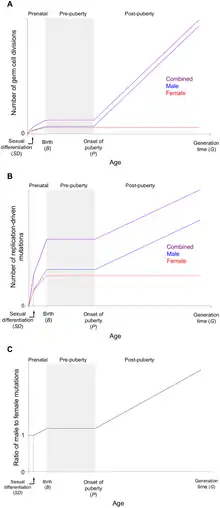 Male mutation bias is also called "Male-Driven Evolution". The rate of male germline mutations is generally higher than in females.[14] The phenomenon of Male mutation bias have been observed in many species.[15]
