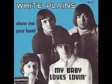 "My Baby Loves Lovin'" was first released by the British pop group White Plains. The song was written and produced by Roger Cook and Roger Greenaway, recorded on 26 October 1969, and released on 2 January 1970 on the Decca Records imprint, Deram Records.[2] It is a world-wide chart success and the top selling single for White Plains.