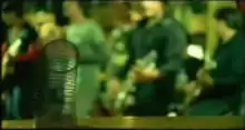 A frame from the "My Happiness" music video showing a sentient slinky dancing as Powderfinger perform the song in the background