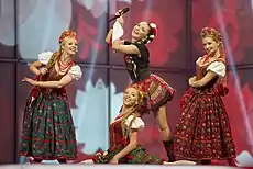 My Słowianie was chosen as Poland's entry for the Eurovision Song Contest 2014 in Copenhagen, Denmark.[1] The performance featured dancers in traditional Polish costumes. Two of the performers were displaying significant cleavage, one of whom was churning butter and the other washing clothing with a washboard, both with suggestive movements.