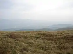 Mynydd Esgairweddan, heather & rough grassland on the open moor. Afon Dyfi meanders in the distance.