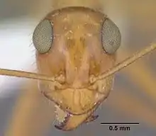 Workers range from 3–7 mm in length and have a light tan thorax, legs and slightly darker head with black mandibles. The gaster is brownish-gray. Queens are roughly 9 mm in length. The head and mandibles are a reddish brown. The thorax is yellowish brown, and the gaster is a lighter shade of yellow. The legs are a dull yellow. Males are typically about 6 mm long and have a small black head and black thorax, except a reddish-brown pronotum. The gaster is a dark brown, and the legs are gray. Males are winged.[2]