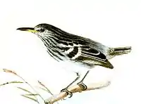 The Guianan streaked antwren was formally described in 1788 by the German naturalist Johann Friedrich Gmelin in his revised and expanded edition of Carl Linnaeus's Systema Naturae. He placed it with the nuthatches in the genus Sitta and coined the binomial name Sitta surinamensis.[2][3] Gmelin based his description on the "Surinam nuthatch" that had been described and illustrated in 1782 by the English ornithologist John Latham in his A General Synopsis of Birds.[4] The Guianan streaked antwren is now placed in the genus Myrmotherula that was introduced in 1858 by Philip Sclater.[5][6] The species is monotypic: no subspecies are recognised.[6]