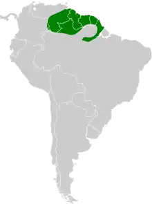 The Guianan streaked antwren is native to the northeastern region of South America. Its range includes southern Venezuela, Suriname, Guyana, French Guiana and northern Brazil, to the north of the Rio Negro and the Amazon River. It is found in the middle and understoreys of seasonally flooded forests and permanently flooded areas as well as shrubby undergrowth in secondary forest at altitudes of up to 550 m (1,800 ft).[8]