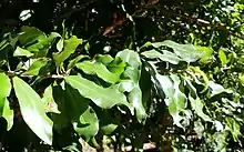 Adult and juveniles leaves are wavy edged but not toothed. Alternate on the stem, simple and elliptic in shape, 4 to 14 cm long. Leaf stems 3 to 8 mm long. Leaves taper to a blunt point. Mid rib is raised on both sides. Leaves have numerous yellow or red dots, or similarly coloured streak patterns.[3][1]