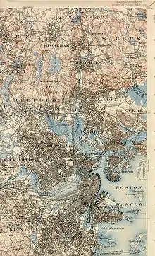 The Mystic River lies to the north of Boston and flows approximately parallel to the lower portions of the Charles River, encompassing 76 square miles (200 km2) of watershed. The river flows from the Lower Mystic Lake and travels through East Boston, Chelsea, Charlestown, Everett, Medford, Somerville, and Arlington. The river joins the Charles River to form inner Boston Harbor. Its watershed contains 44 lakes and ponds, the largest of which is Spot Pond in the Middlesex Fells, with an area of 307 acres (124 ha). Significant portions of the river's shores are within the Mystic River Reservation and are administered by the Massachusetts Department of Conservation and Recreation, which include a variety of recreation areas.[2]