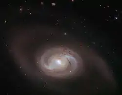 Observations of the central 20 arcseconds of the galaxy by the Hubble Space Telescope showed spiral arms that corresponded to the inner ring. The central ovoid of the galaxy was found to feature a bar-like structure and two arc structures that form a partial nuclear ring. Its emission is associated with the presence of HII regions.[7] Around the nucleus lies a dusty ring-like structure, with a radius of 7 arcseconds, better seen at its northwest part. Another dusty ring is observed with 20 arcseconds radius.[8]