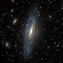 NGC 7331 Group is a visual grouping of galaxies in the constellation Pegasus. Spiral galaxy NGC 7331 is a foreground galaxy in the same field as the collection, which is also called the Deer Lick Group.[1] It contains four other members, affectionately referred to as the "fleas": the lenticular or unbarred spirals NGC 7335 and NGC 7336, the barred spiral galaxy NGC 7337 and the elliptical galaxy NGC 7340. These galaxies lie at distances of approximately 332, 365, 348 and 294 million light years, respectively.[2] Although adjacent on the sky, this collection is not a galaxy group, as NGC 7331 itself is not gravitationally associated with the far more distant "fleas"; indeed, even they are separated by far more than the normal distances (~2 Mly) of a galaxy group.