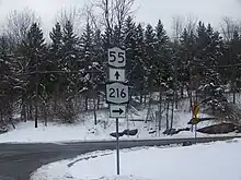 NY 52 and NY 216 largely swapped alignments in Spring 1937 as part of a larger realignment of NY 52 through Dutchess and Putnam counties. Route 52 was relocated onto NY 216 between Stormville and Ludingtonville, from where it followed a new roadway south to Lake Carmel. The former alignment of NY 52 between Stormville and Towners became NY 216, which was also extended eastward along NY 164 to a new eastern terminus at NY 22 east of Towners.[7][8][9] The alignment of NY 216 remained unaltered until January 1, 1970, when Route 216 was truncated to its current eastern terminus in Poughquag. As part of the truncation, NY 216's former alignment from West Pawling to Patterson was renumbered to NY 292 while the east–west roadway through Towners became NY 164.[10]