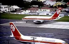 The first Boeing 737, ZK-NAC, arrived from Seattle via Hawaii and Fiji into Wellington airport in the new livery of "National Airways" all-white body, blue titles, with a red cheatline and striking red 'Godwit' roundel on the tail. With the arrival of ZK-NAD and ZK-NAE, full services were introduced in 1968 on the "main trunk" (Auckland–Wellington–Christchurch–Dunedin). Later this extended to Invercargill, Palmerston North and Hamilton in 1975 as more aircraft were added, including ZK-NAM which had been the Boeing 737-200 prototype, N1359B. Viscounts were retired as demand for jet services grew and two more 737s joined the fleet as replacements.