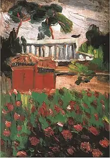 The drawing is estimated to have been made in 1928 during Na's stay in Paris as part of her 21-month trip around the world with her husband. The painting is 60 centimeters long (24 inches) and 50 centimeters wide and depicts a typical landscape painting of a French village with surrounding trees and a red-roofed house with white walls. The bold brush strokes in the work simplify the object while also bringing it to life, and elements of Fauvinism and expressionism can also be found in it.
