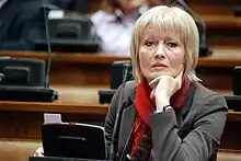 In 2010, she played a prominent role in ensuring the Serbian assembly's approval of a declaration condemning the 1995 Srebrenica massacre.[25] Later in the same year, she described Serbian president Boris Tadić's diplomatic visit to Vukovar as an important step in improving relations between Serbia and Croatia.[26]