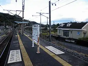 The station consists of an island platform serving two tracks on an embankment. The station building is across a road and is unstaffed, serving only as a waiting room. Access to the platform is by means of an underpass through the embankment.[3][2]