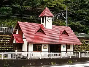 The station has two opposed side platforms serving two tracks, connected to a small red-roofed station building by a level crossing. The station is unattended.