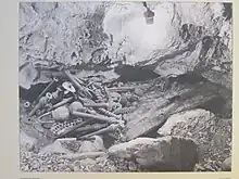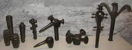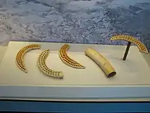 The Nahal Mishmar hoard is the hoard of archaeological artifacts found by a 1961 expedition led by Pessah Bar-Adon in a cave by Nahal Mishmar in the Judaean Desert near the Dead Sea, Israel. The collection wrapped in a straw mat found under debris in a natural crevice contained 442 objects: 429 of copper, six of hematite, one of stone, five of hippopotamus ivory, and one of elephant ivory. Carbon-14 dating of the mat suggests the date at least 3,500 BCE, i.e., it places the hoard into the Chalcolithic period.[1][2][3][4][5]