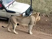 The park has a large and diverse wildlife population.[3] Species found in the park include lion, leopard, African buffalo, black rhinoceros, giraffe, hippopotamus, spotted hyena, blue wildebeest, plains zebra, cheetah, Thomson's gazelle, Grant's gazelle, common eland, impala, hartebeest, waterbuck, common warthog, olive baboon, black-backed jackal, common ostrich, and Nile crocodile.[10][12]
