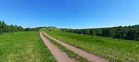 The Nakas rises in northern Tyulgansky District, near the border with Bashkortostan. Rather than a mountain or ridge the Nakas is an elevated area, where its 667.6 m (2,190 ft) high summit —the highest point of Orenburg Oblast— is only a slightly bulging plateau.[5] Despite the lack of pronounced relief the Nakas forms an important drainage divide, separating the basins of the Belaya, Salmysh and Bolshoy Ik rivers.[3][6]