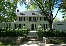 The Paul & Julia Stark house at 734 Huron Hill is a 2-story Colonial Revival home built in 1921.[14] After WWI there was a burst of building in the subdivision and Period Revival styles taking over from Prairie School and Craftsman styles.[4] Colonial Revival was a long-popular style that had appeared around 1880, based on early English and Dutch-styled houses from the East Coast. It continued to be popular until 1955.[15] Hallmarks of the style in this house are the symmetric façade, the front door with sidelights and pilasters, and the multi-pane windows. Classical columns are also common, though not usually massive ones like those flanking the sunroom in this house. The stucco exterior is also less common. Paul Stark was the real estate man who promoted Nakoma starting in 1920, when growth in the subdivision began to boom.[4] Of the 500 contributing buildings in the district, 321 are Colonial Revival style.[3]