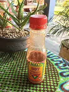 Nali is made from peri-peri sauce from Malawian birds eye chillies which are the hottest in Africa. They have been produced by Nali ltd since the 1970s. There are currently 7 different flavors of Nali Sauces: Mild, Hot, Gold, Garlic, Ginger, Curry Masala and BBQ.[2] The label on the bottle comes with a warning in English and Chichewa that reads, "Abale Samalani", friends, take care.[4] Nali has a strong presence in Zambia, Zimbabwe, Tanzania, Kenya, Mozambique and South Africa.[5][6]