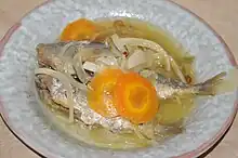 Nanbanzuke or nanban-zuke (Japanese: 南蛮漬け, literally "southern barbarian pickle (marinade)") is a Japanese fish dish. To prepare it, the small fish (often Japanese jack mackerel or wakasagi smelt) (Sprat) or diced fish (salmon, trout, sea bass, ocean perch, cod, haddock, Pollack, Hake, Plaice, and Monkfish) is lightly dusted with potato starch or cornstarch and then deep fried until golden brown. It is then served in a hot broth (Nanbanzu 南蛮酢, or Tosazu 土佐酢) made of grain vinegar, dashi, mirin, and shō-yu (Japanese soy sauce), with finely-sliced onion, finely julienne carrots, finely-shredded green peppers, and red chilli peppers. It bears a close resemblance to escabeche and is believed to have been brought to Japan by the Portuguese (Southern Barbarians) in the 16th century.