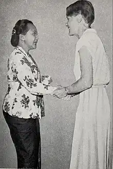 In 1957, she served as a delegate to a United Nations conference in Colombo on increasing participation in civic life for Asian women.[2][1] In 1958, she participated in a 'study tour' of Australia to build cross-country links between Indonesian and Australian women's organizations.[6] In 1959, she was awarded a scholarship in honor of Elin Wägner by the Swedish government to carry out research on the history of Indonesian women's rights.[1] Described as a "forthright and experienced" woman, she was one of a number of prominent feminist leaders of the 1950s.[7] Mujīburraḥmān, an Indonesian historian, calls her "a leading activist of women's rights" in post-independence Indonesia.[8]