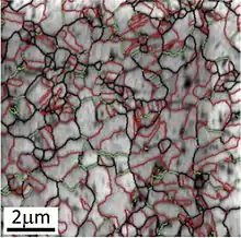 Surface of a nanotwinned copper film with highlighted Σ3 and low angle grain boundaries as imaged by EBSD. Image adapted from Zhao et al.[1]