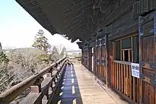 The temple's Sanmon gate was originally constructed in the 13th century, destroyed in 1369 at the order of the government, and reconstructed in 1628.[7] The gate contains stairs to an elevated viewing area, which was the setting for a famous scene in the 1778 Kabuki play Sanmon Gosan no Kiri[8] inspired by the story of the criminal Ishikawa Goemon who is said to have spoken of the beauty of the view (but who was executed prior to the construction of the current gate).[7]