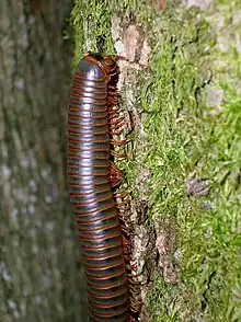 Narceus americanus is a large millipede of eastern North America. Common names include American giant millipede,[1] worm millipede, and iron worm.[2] It inhabits the eastern seaboard of North America west to Georgetown, Texas, north of the Ottine wetlands.[3] It has a nearly cylindrical gray body, reaching a length of 4 inches (100 mm).[4] They can be commonly found in or under decaying logs from March to October.[5] When threatened, they sometimes curl up or release a noxious liquid that contains large amounts of benzoquinones which can cause dermatological burns. This fluid may irritate eyes or skin. Many other millipedes secrete hydrogen cyanide, and while there have also been claims that N. americanus releases hydrogen cyanide, they are unsubstantiated. They do, however, excrete a substance that causes a temporary, non-harmful discoloration of the skin known as millipede burn.[6]