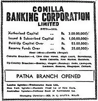 After completing his studies, Dutta's eldest son Bata Krishna Dutta returned to Comilla and joined the Comilla Banking Corporation as a trainee. After a few weeks Dutta suggested that Bata Krishna himself could run a bank himself and young Bata Krishna took up the challenge. In 1930, Bata Krishna Dutta took charge of the defunct Comilla Rice and Oil Mills Limited and established the New Standard Bank of India with an initial paid-up capital of thirty thousand rupees.[2]