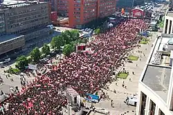 Senior figures in the Russian Presidential administration encouraged the formation of the group, which Moisés Naím labelled a government organized non-governmental organization (GONGO).[15] By late 2007, it had grown in size to some 120,000 members aged between 17 and 25. On April 6, 2012, the Nashi leader announced that the current form of the movement would dissolve in the near future, possibly to be replaced by a different organisation. He stated that Nashi had been "compromised" during the 2012 Russian presidential election.[16] In 2013, the organization ceased its activities and on December 2, 2019, the legal entity was liquidated.[17]